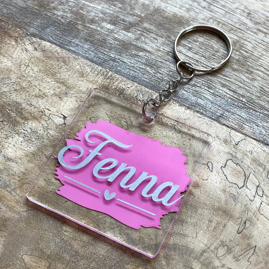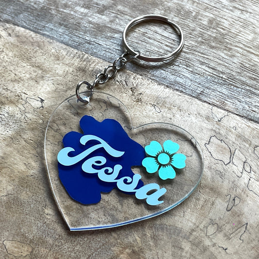 Sleutelhanger Plexiglas hart met naam en bloemetje