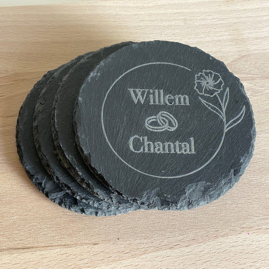 Onderzetter leisteen huwelijk '2x naam met ring en bloem'